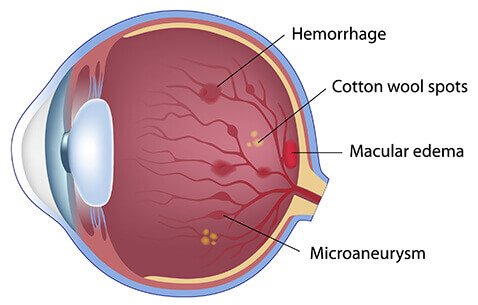A damage to the blood vessels in the retina caused by prolonged high blood sugar